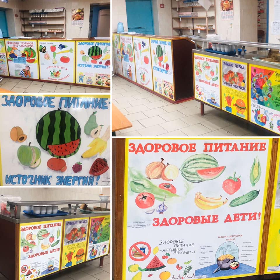 Работы победителей и призеров конкурса были сканированы, перенесены на материал, устойчивый к внешним воздействиям, и теперь украшают школьную столовую. Каждый посетитель столовой может получить и эстетическое удовольствие, и обогатить свое представление о правильном и здоровом питании.